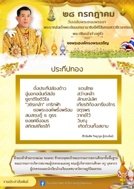 วันที่ 28 กรกฎาคม วันเฉลิมพระชนมพรรษา ของพระบาทสมเด็จพระปรเมนทรรามาธิบดีศรีสินทรมหาวชิราลงกรณ พระวชิรเกล้าเจ้าอยู่หัว